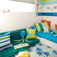 children sleep and play surrounded by the most colorful and joyful colors. But in the bedroom decor is more calm and limited stripes on the walls. And in the games room soloed multicolor striped wall and floor covering made of colorful squares. In simple form on the shelves will have plenty of space to store toys and books.